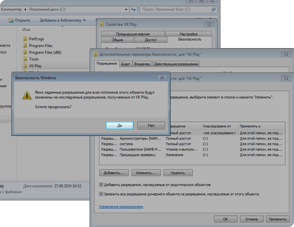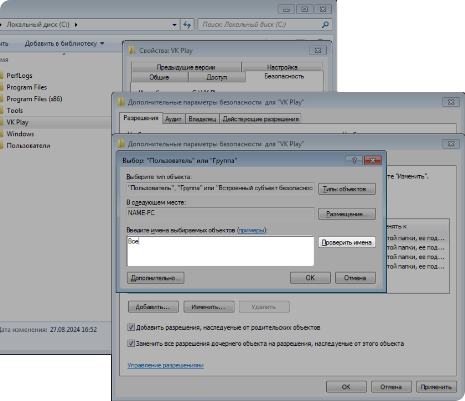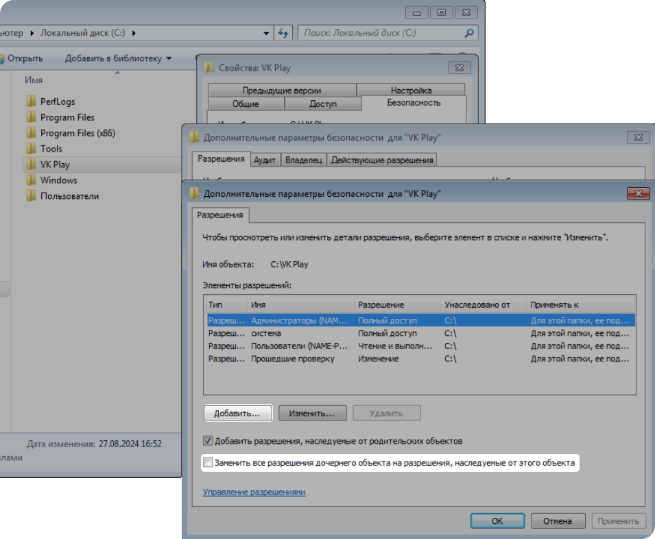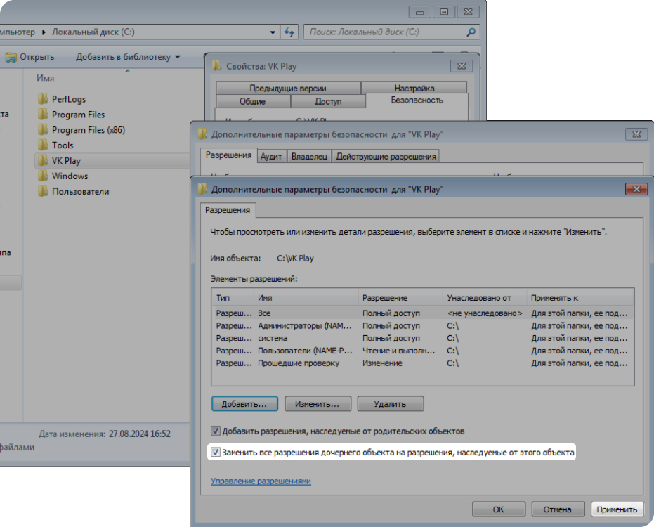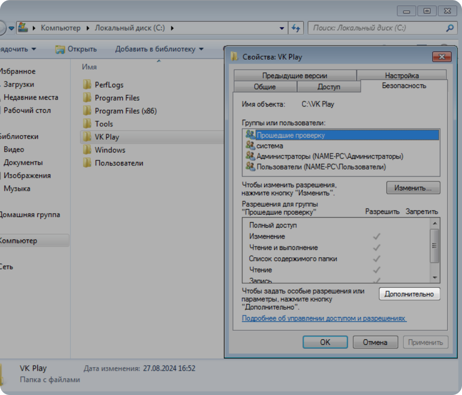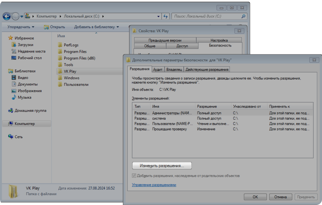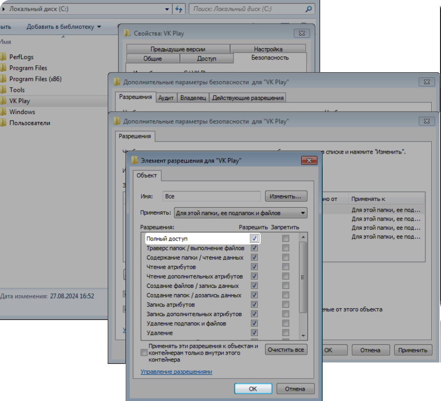 Чтобы исправить ошибку, дайте полный доступ к папке VK Play для всех пользователей Windows.
